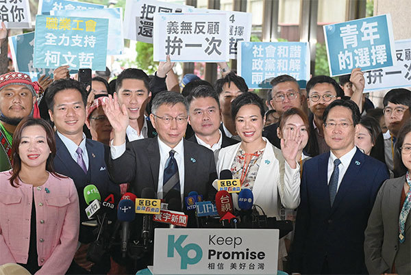 2023年11月24日,台灣民眾黨主席兼總統候選人柯文哲(左中)和副手吳欣盈登記參選。(Sam Yeh / AFP)