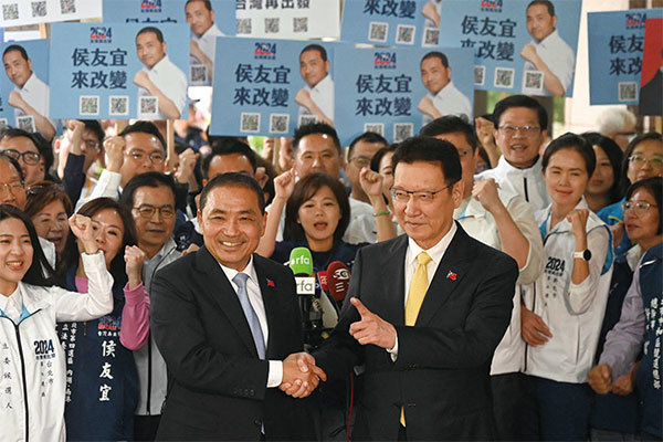 2023年11月24日,國民黨台灣總統候選人侯友宜(左)與副總統候選人趙少康登記參選。(Sam Yeh / AFP)