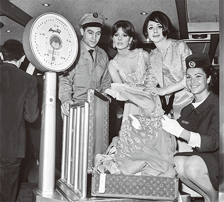 喬治.威登用父親姓名中的簡寫L及V配合搭成花朵圖案,設計出蜚聲國際的交織字母。圖為1965年5月,時尚模特兒在奧利機場展示路易威登行李箱。(AFP)