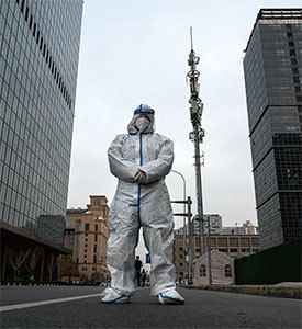 中共散播疫情,毒害全世界的三年間,中國經濟全面垮塌,「一夜回到改開前」。圖為2022年11月22日,北京,一名防疫工作人員站在中央商務區中間的大道上。(Kevin Frayer / Getty Images)