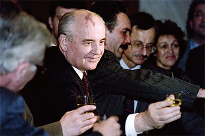 1991年12月26日,蘇聯宣布停止存在,存世69年的共產政權正式解體。圖為1991年12月26日戈爾巴喬夫(中)在為他舉行的告別派對上舉著酒杯。(Vitaly Armand / AFP)