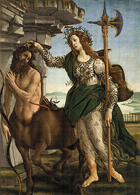 這幅通常稱作〈帕拉斯與半人馬〉(Pallas and the Centaur)的不朽神話題材畫作,是波提切利傑出的經典作品之一:在嶙峋的懸崖之下,背襯著杳遠的風景,兩個真人大小的人物在前景中姿態隨意地佇立。左側是一個半人馬(centaur),這是古代神話中的半神造物,其獸性往往和放蕩的激情和色慾聯繫在一起。右側是一位衣袍華美的女子,她抬起手臂抓住半人馬的一縷捲髮,冷靜地看著他。