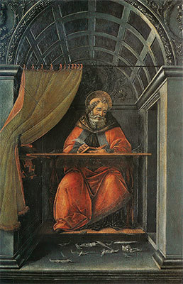小巧精緻的〈書房中的聖奧古斯丁〉(St. Augustine in His Study)就完成於這樣的動盪時期;那時,波提切利對古代異教的人文主義興趣,與他深切的基督教信仰之間似乎發生了不可調和的衝突。畫中可見,在一間簡樸的拱形密室中,坐著希波的奧古斯丁(Augustine of Hippo)——4、5世紀間的著名神學家與哲學家。他看似正在一本袖珍書冊上靜靜寫作,地上的廢羽毛筆和散落的碎紙片,卻透露出這位作者的內心遠未平靜。