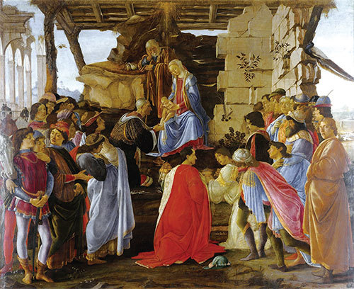 桑德羅.波提切利,〈東方三賢士來拜〉(Adoration of the Magi),約1475至1476年作,畫板蛋彩畫,111×134cm,佛羅倫薩烏菲茲美術館藏。(公有領域)