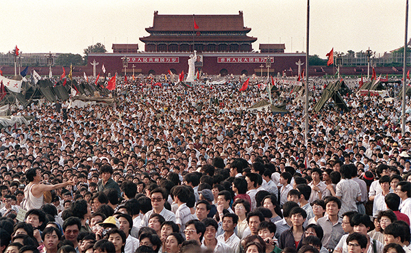 1989年4月中下旬開始,大批的學生和民眾不斷從各地趕到北京爭取民主。圖為1989年6月2日,北京,大批群眾聚集在天安門廣場。(Catherine Henriette / AFP)