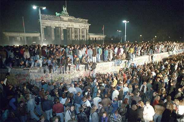 1989年11月9日柏林牆在東德居民的壓力下被迫開放,民眾開始自發拆除柏林牆。圖為1989年11月10日數千名年輕的東柏林人聚集在勃蘭登堡門附近的柏林圍牆頂上。(Peter Kneffel / dpa / AFP)