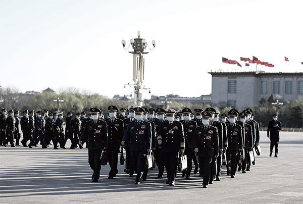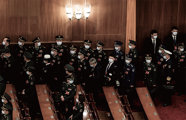 九將軍落馬只是冰山一角,主要因為他們身兼全國人大代表、政協代表職務而曝光。圖為2023年3月5日中共人大會議開幕後,中共軍方代表散場。(Lintao Zhang / Getty Images)