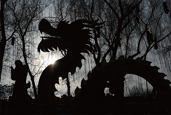 1976年龍年,天降隕石雨,唐山大地震。2024年又逢龍年,中共便遭遇一連串的凶兆。圖為2024年2月11日大年初二,北京龍潭公園集市上的龍像。(Pedro Pardo / AFP)