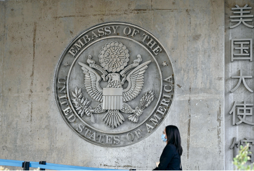 中國大陸股市暴跌,股民慘賠湧入美國駐華大使館微博留言求救,四天留言量超過15萬。美國駐華大使館微博成為中國散戶的哭牆。圖為在中國北京的美國大使館。(Jade Gao / AFP)