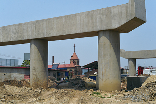 中共下令天津等12個省市停止基建,以控制債務風險。圖為2015年天津一座在建高速公路橋支架。(Greg Baker/AFP)