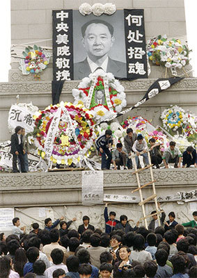 以「實事求是」為原則,胡耀邦為恢復中華傳統文化打開了時代的大門。圖為1989年4月19日,北京學生聚集在天安門廣場紀念碑前哀悼胡耀邦。(Catherine Henriette / AFP)