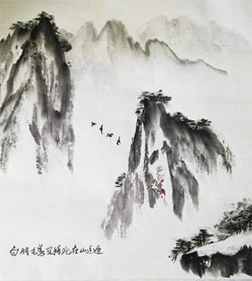 洛陽賒刀人留下的預言「夷畿素羽,竟墜羕泉」,指素羽意外墜落導致死亡!這和《鐵版圖》的預言異曲同調。《鐵板圖》最後一張圖云:一隻白羽毛鳥兒撞死在山這邊。(公有領域)