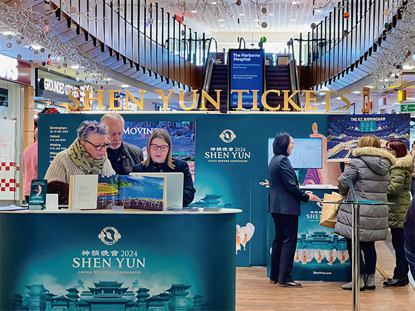 2023年12月英國觀眾在預購2024年神韻票。(《大紀元》)