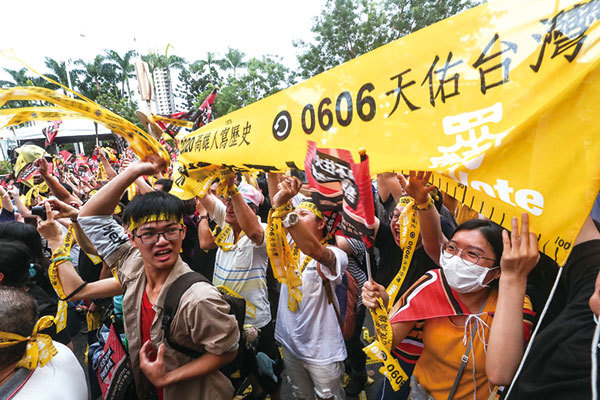 2020年6月6日,上任一年多的台灣高雄市長韓國瑜確定遭到罷免,成為台灣史上首名被罷免的市長。罷韓總部外民眾開心拉起民主黃絲帶並熱情歡呼。(中央社)