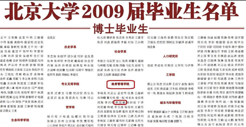 不料此言很快被人以「北大2009年博士畢業生名單」砸到。韓國瑜名字赫然登在「政府管理學院」之中。基進黨為此向韓國瑜喊話,「若要自清,請向北大提告記載不實或請北大出面向你道歉、還你清白。」