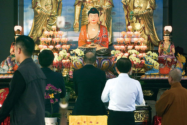 2020年1月11日,台灣主要反對黨國民黨總統候選人韓國瑜(中,黑衣)在高雄林園區投票後,在普院寺祈禱。(Hsu Tsun-hsu / AFP)