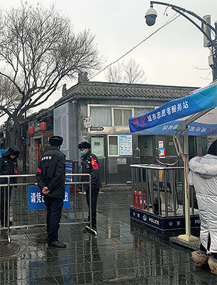 常德民眾韓先生披露,疫情這幾年,他身邊擁護共產黨的底層老粉紅基本死光了。圖為2020年2月29日,北京商業區南鑼鼓巷進入戒嚴狀態,進出需要證件。(大紀元)