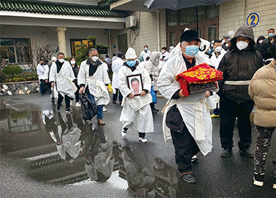 2023年1月14日,中國上海的一場葬禮上,穿著白色喪服的送葬者抬著親人的骨灰。(Kevin Frayer / Getty Images)