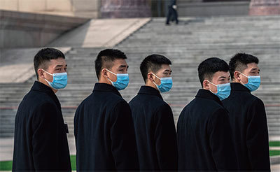 2024年3月10日,北京人民大會堂外的保安都戴著口罩。(Kevin Frayer / Getty Images)