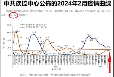 3月11日,中共疾控中心曾通報了2月份的疫情,通報寫道:2024年2月1日至2月29日,全國報告新增重症病例358例、死亡病例22例……哨點醫院監測……流感樣病例新冠病毒陽性率從2024年1月29日至2月4日的3.3%上升到2月26日至3月3日的14.3%。