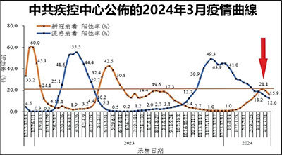 中共疾控中心公布的疫情曲線顯示,2024年3月11日至3月17日的新冠病毒陽性率為21.1%,與2023年1月9日至1月15日的24.1%接近。同時,流感病毒陽性率卻一直在下降。(網站截圖/大紀元製圖)