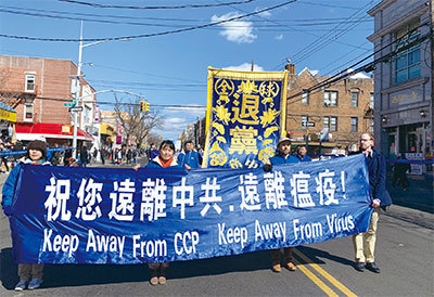 在中國大陸的疫情循環中,中共高官、高級將領、各界精英等密集病亡。圖為2020年3月1日,紐約部分法輪功學員在布碌崙遊行,告訴人們「遠離中共 遠離瘟疫」。(林丹/大紀元)