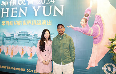 2024年4月13日晚間,倉薩貢噶仁波切偕妻子觀賞神韻紐約藝術團在苗北藝文中心的第二場演出。(龍芳/攝影)