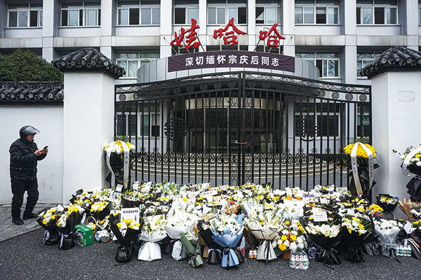 2024年2月28日,杭州娃哈哈工廠外堆滿弔唁宗慶後的花束。(STR / AFP)