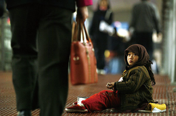 就在海內外中文媒體關注婦女被拐事件的幾乎同時,十幾個中國青少年連續失蹤的新聞再次引爆網路。圖為2004年11月9日,北京一名女孩在人行天橋上乞討。(Peter Parks / AFP)