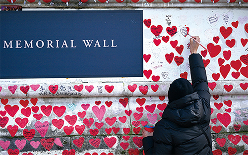 2024年3月3日,一個人在倫敦泰晤士河南岸的國家新冠紀念牆上作畫。(Justin Tallis / AFP)