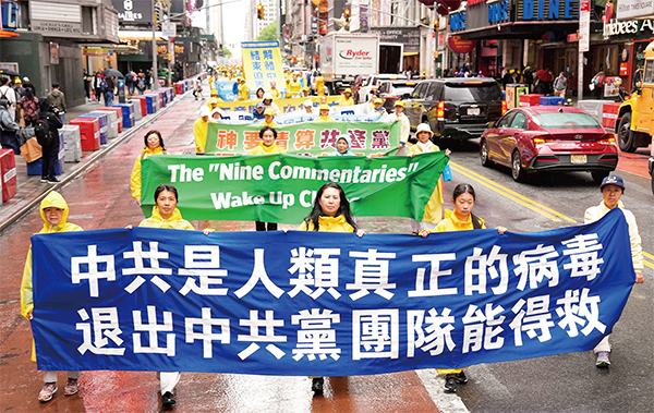 新冠病毒有幾個特點與中共相似,人要自救得從思想上、體制上清除中共毒素。圖為2024年5月10日法輪功學員曼哈頓大遊行中的「中共是人類真正的病毒 退出中共黨團隊能得救」橫幅。(戴兵/大紀元)