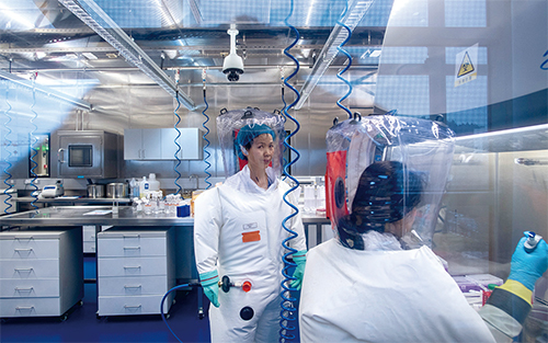 石正麗團隊在《自然》雜誌發表論文稱新冠病毒與該所2013年發現的雲南蝙蝠病毒相似性超高,海外專家批她「造假過於明顯」。圖為2017年2月23日,石正麗在武漢P4實驗室。(Johannes Eisele / AFP)