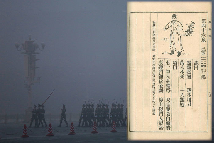唐朝李淳風所著的《推背圖》第46象,被發現和今天世界正在發生的重大事件非常吻合。底圖為北京天安門一景。(新紀元合成圖)