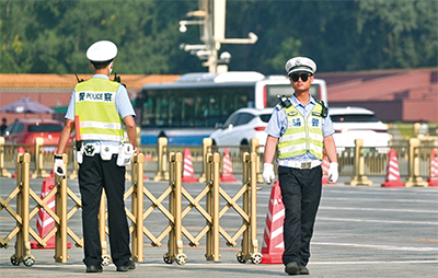 今年6月4日逢「8964」慘案35周年,風雨飄搖的政局讓北京十分緊張,天安門廣場周邊戒備森嚴。圖為6月4日警察駐守在北京紫禁城牆外。(Adek Berry / AFP)