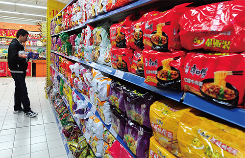 一名男子在北京一家超市選購泡麵。(Frederic J. Brown / AFP via Getty Images)