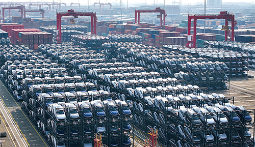 2024年2月8日,中國江蘇省蘇州市太倉港的國際碼頭,等待裝運的比亞迪電動車堆積如山。(STR / AFP via Getty Images)