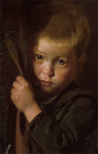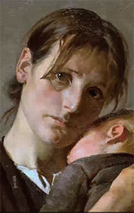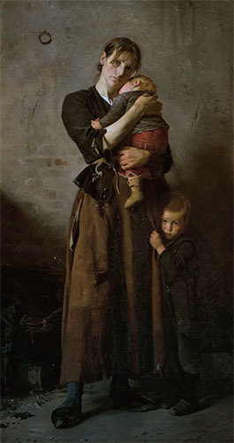 畫題〈棄〉(Abandoned),1888年作。女人的眼神如此哀戚,手中緊緊抱著幼兒,腳旁還有拉著女人裙角、眼神怯畏的小男孩,生怕有人將他從母親身邊拉開。