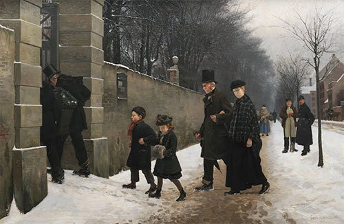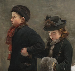 他的另一張畫題〈葬禮〉(Funeral),1893年。嚴冬,在白雪覆蓋的路上,一行人列隊正要走進入墓園,小孩、老人還有一位身懷六甲的女人。從他們的裝束中看,應該是來自中產階級的家庭。老人臉上憂傷的表情幾乎是靜止的,旁邊這位懷孕的女人也是,不言而喻這個老人應是女人的父輩。他們像沉浸在某種回憶中,走在前頭的兩個小孩也是。整個畫面定格在一種默然無語的憂傷中,除了站在這家人隊伍最後站立的旁觀者:兩個壯碩的男人。