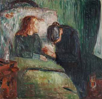 1885年孟克創作了〈生病的孩子〉(Sick Child)全畫逸筆草草、色彩極簡,臉色蒼白的女孩坐在床上,母親眼光直視床前低著頭兩手合握,痛苦得不忍看孩子的臉,透過母親的無助傳遞孩子病情的無解。整幅畫主色是黑綠色調一種非自然的色彩,而顯得更悽愴。孟克善用色彩表現出強烈人類內心的情緒。