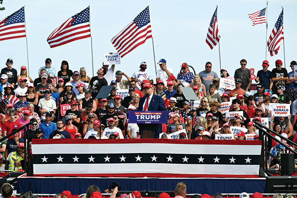 2024年6月18日,特朗普在威斯康星州拉辛舉行的競選活動上發言。(Jim Watson / AFP via Getty Images)