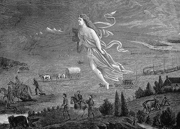 民主體制需要基本的信任和寬容,美國這次對特朗普的審判,破壞了這種基本的信任,這是未來美國與世界的危機所在。圖為19世紀一幅畫作描繪女神幫助美國拓荒者建立文明。(Kean Collection / Getty Images)