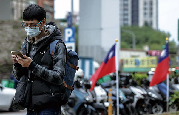 中共發起的網路攻擊和假訊息活動對台灣的威脅越來越大。圖為總統大選前夕,2023年12月22日一名男子在台灣國旗旁看著手機。(I-Hwa Cheng / AFP)
