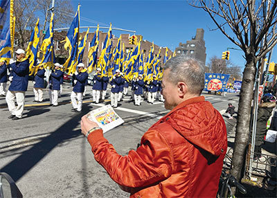 2024年3月3日,大陸移民觀看法輪功在布碌崙的遊行。(施萍/大紀元)
