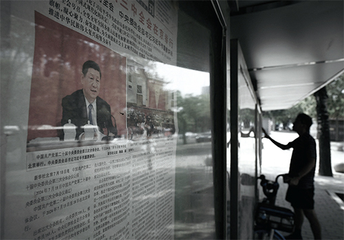 2024年7月19日,北京人行道上的展板展示有關三中全會閉幕的報紙報導。(Greg Baker/AFP via Getty Images)