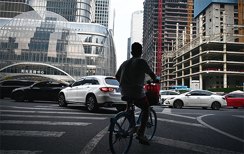 2024年7月11日,一名男子騎自行車穿過北京中央商務區。(Greg Baker/AFP via Getty Images)