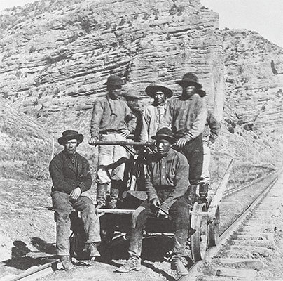 1875年左右,包含華裔的鐵路工人在加州內華達山脈的鐵路手推車上。(Graphic House / Archive Photos / Getty Images)