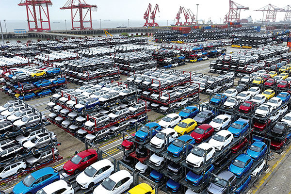 2024年4月16日,江蘇省蘇州市,太倉港國際集裝箱碼頭堆放的大批量待出口電動汽車。(STR / AFP via Getty Images)