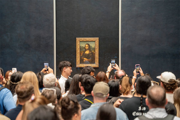 2024年6月7日,法國巴黎盧浮宮博物館內,一群遊客手持手機為達芬奇的〈蒙娜麗莎〉拍照。