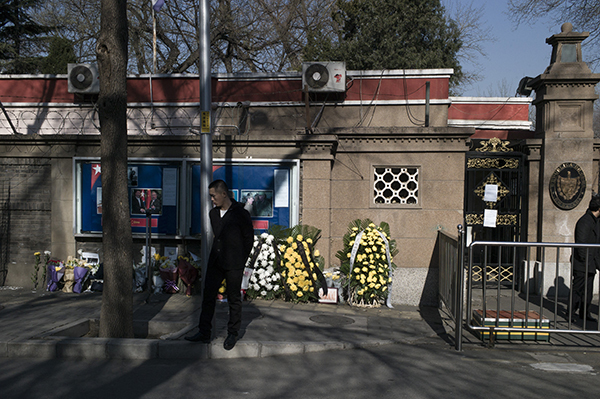 2016年11月28日,古巴獨裁者卡斯特羅去世三天後,古巴駐北京大使館入口處放置花圈。(Fred Dufour/AFP via Getty Images)