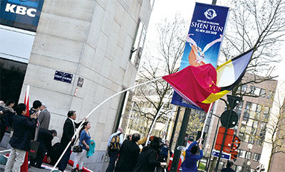 2014年3月30日習近平訪比利時期間,中共大使館官員向當地政府施壓取消神韻演出與廣告失敗後,試圖遮擋習下榻酒店前的神韻海報。(Georges Gobet / AFP via Getty Images)